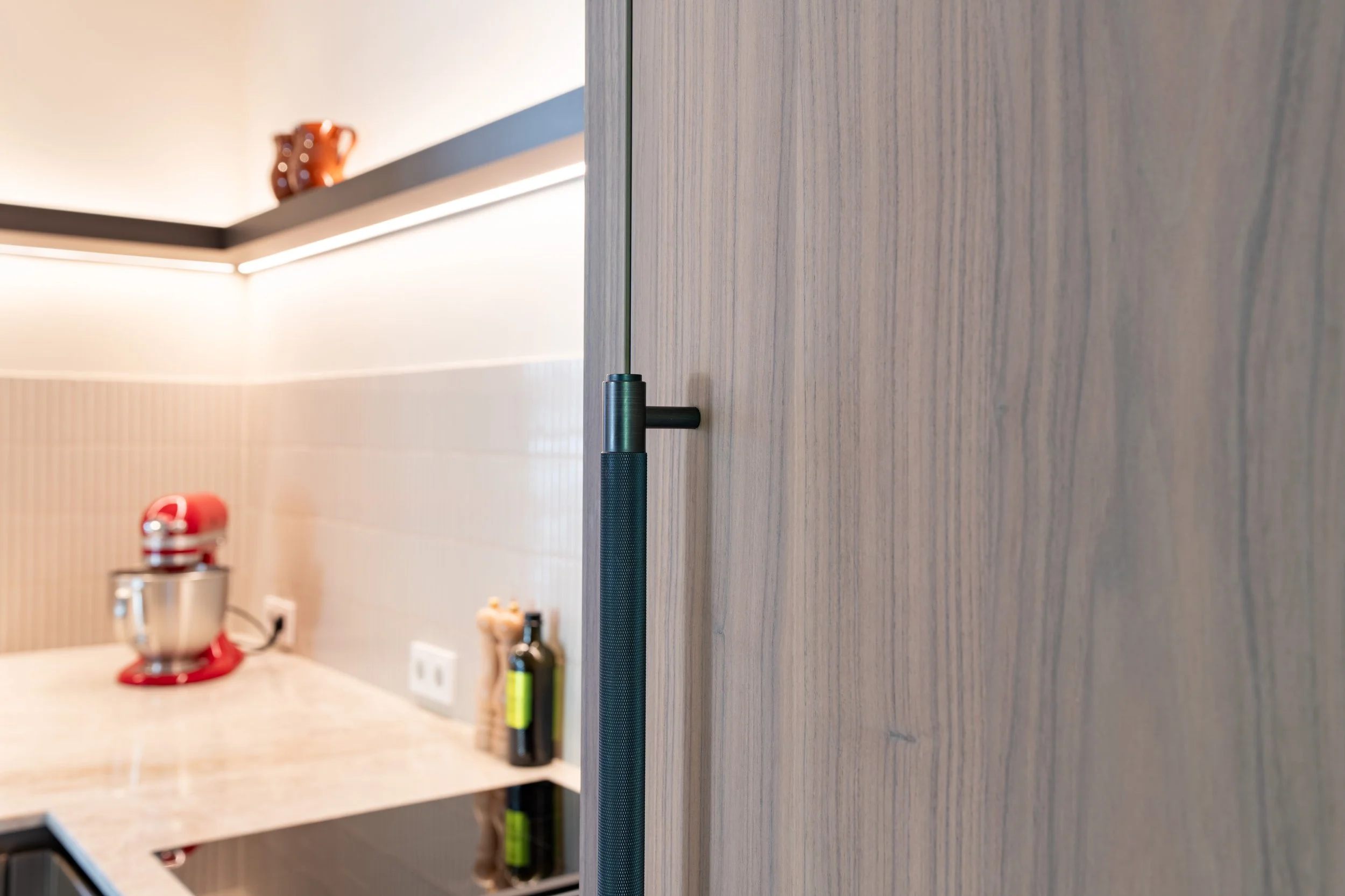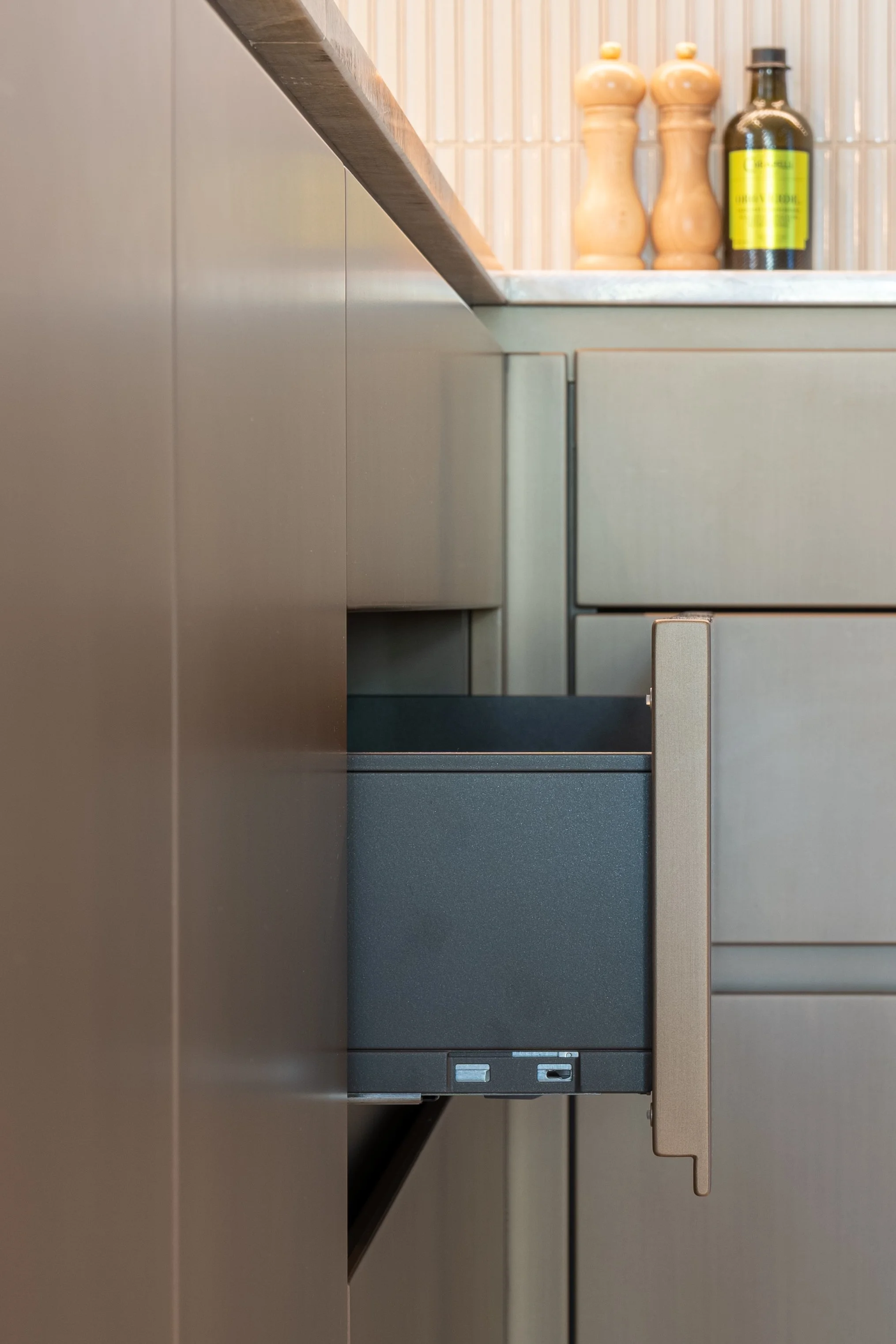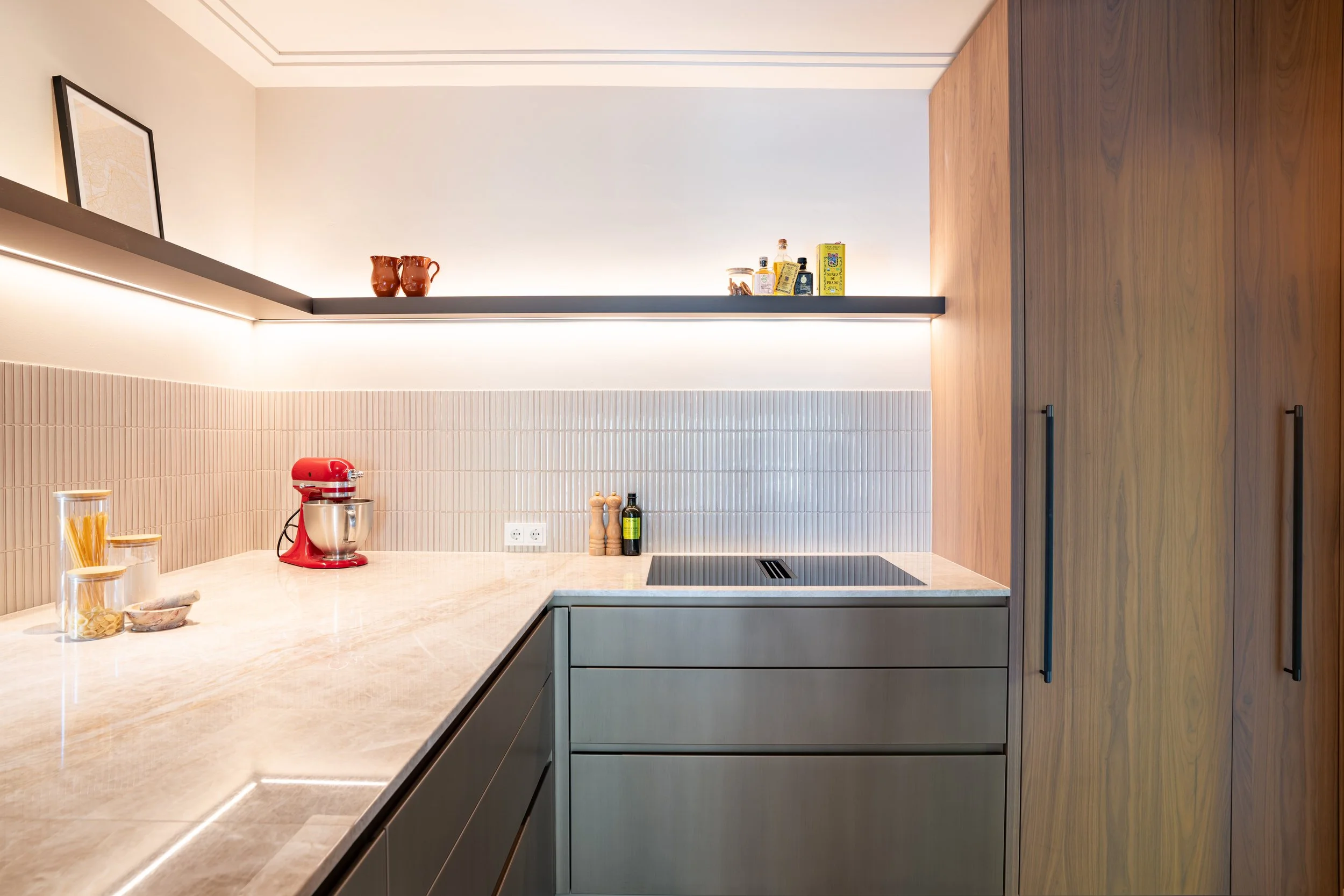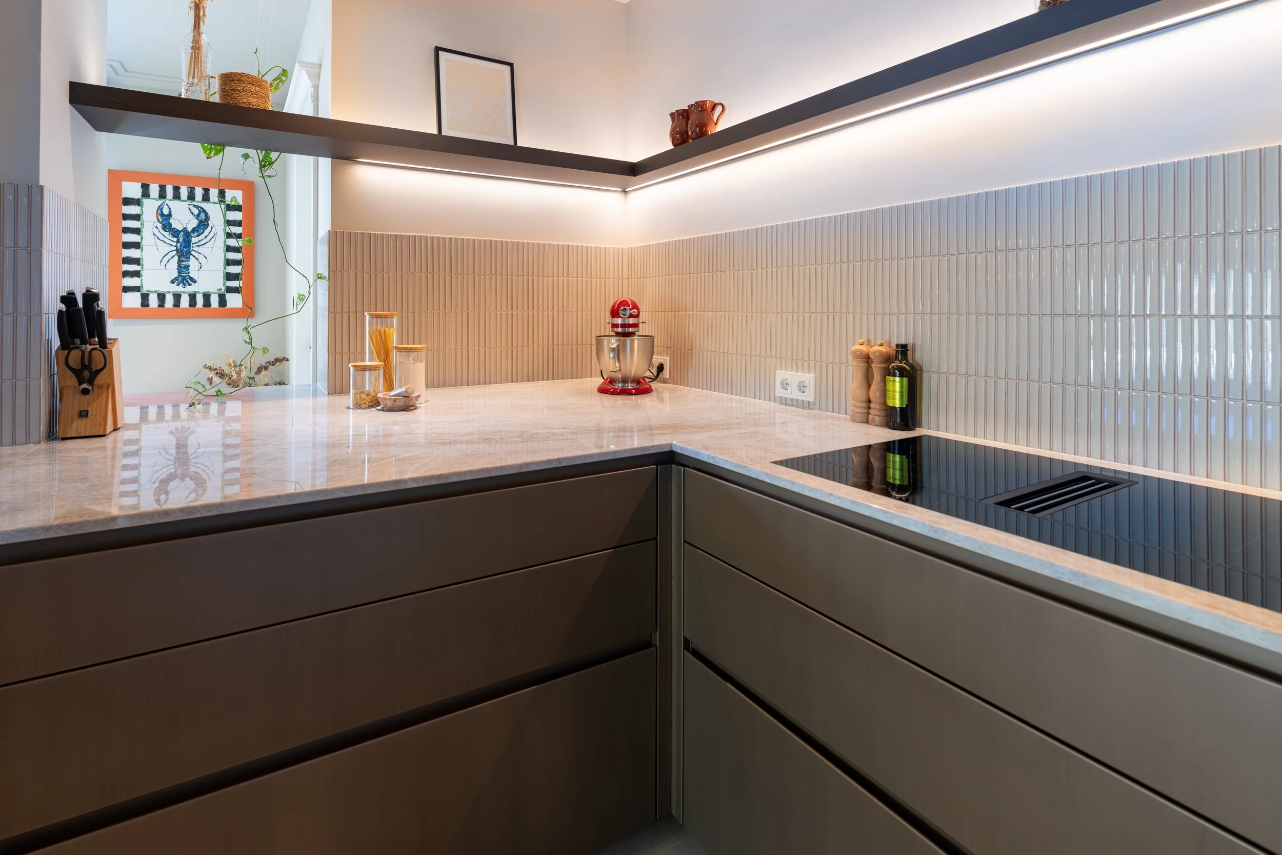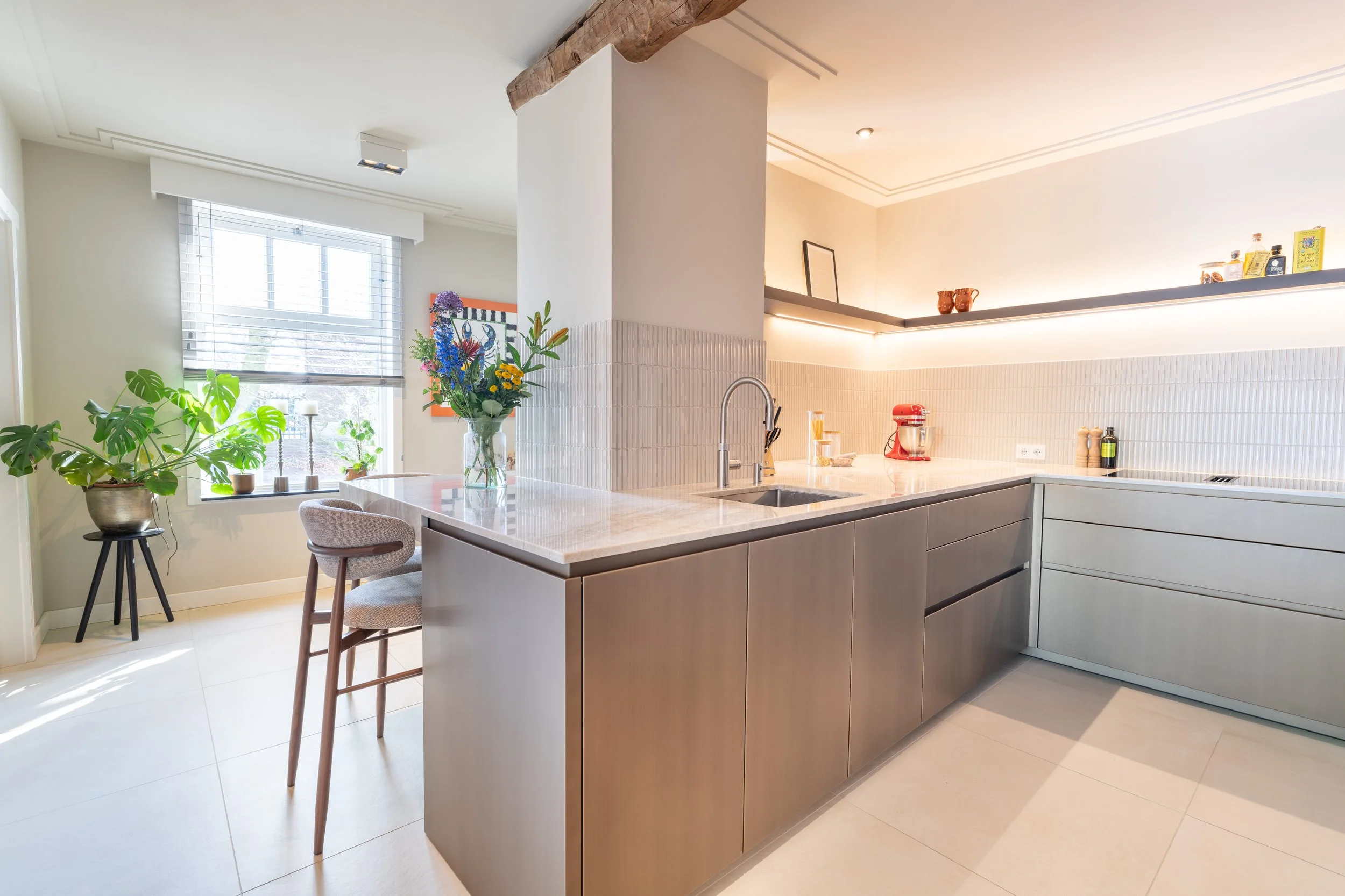 Deze keuken is een statement van vakmanschap en detail. In een uitdagend gevormde ruimte met authentieke elementen komt het ontwerp volledig tot zijn recht. De metallic lak vangt het licht subtiel, terwijl het marmeren blad en de zorgvuldig gekozen 3D-tegels zorgen voor karakter en diepte Daarom heeft het een krachtige uitstraling, maar blijft hij tijdloos in gevoel.