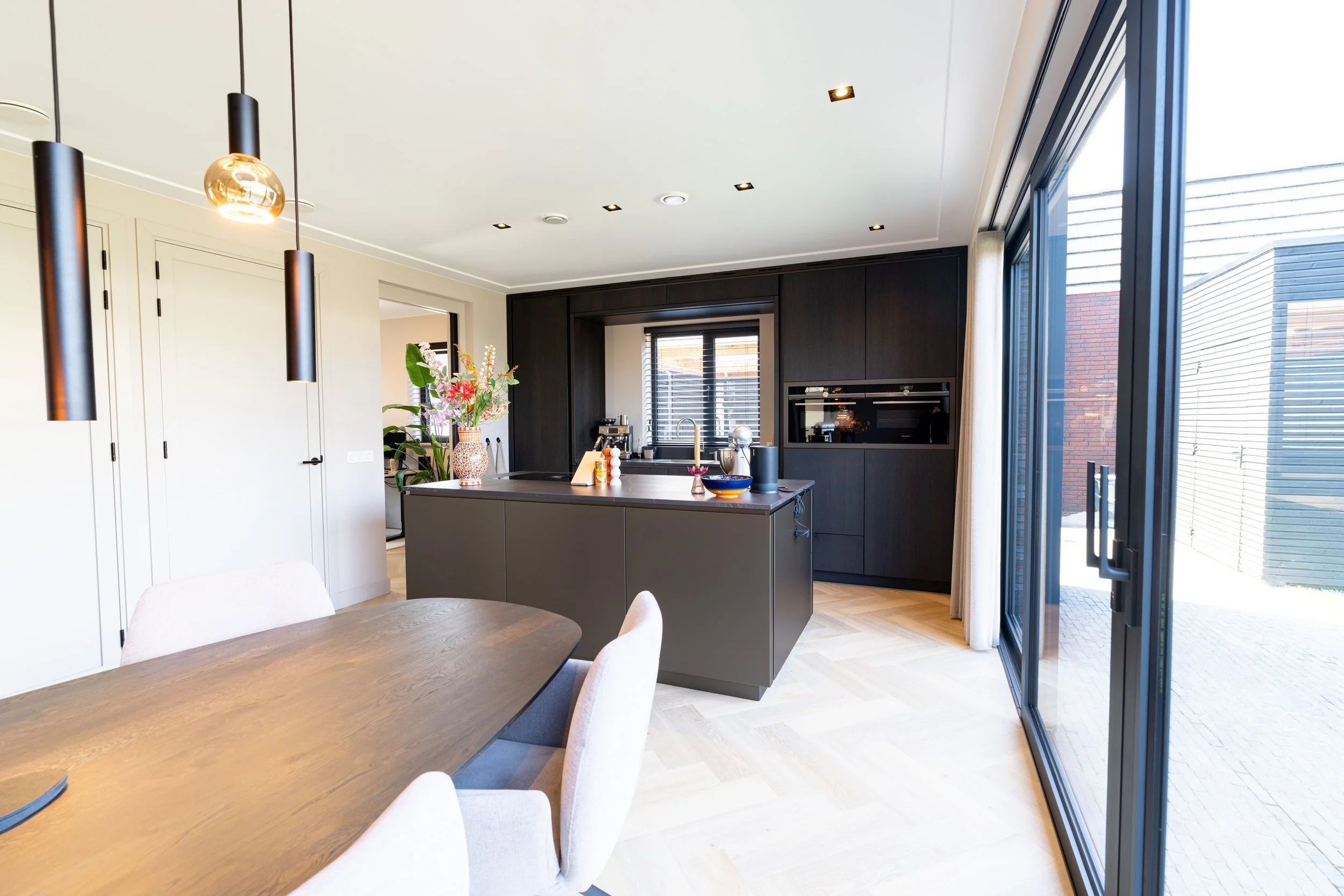 Deze op maat gemaakte zwarte keuken met royaal keukeneiland oogt minimalistisch, maar zit vol verfijnde details. Het lijnenspel is rustig en doordacht, met verborgen grepen en een afwerking die klopt tot in de kleinste elementen. De metallic afwerking van het eiland keert subtiel terug in de terugliggende greeplijsten van de kastenwand .Minimalistisch, maar met karakter.